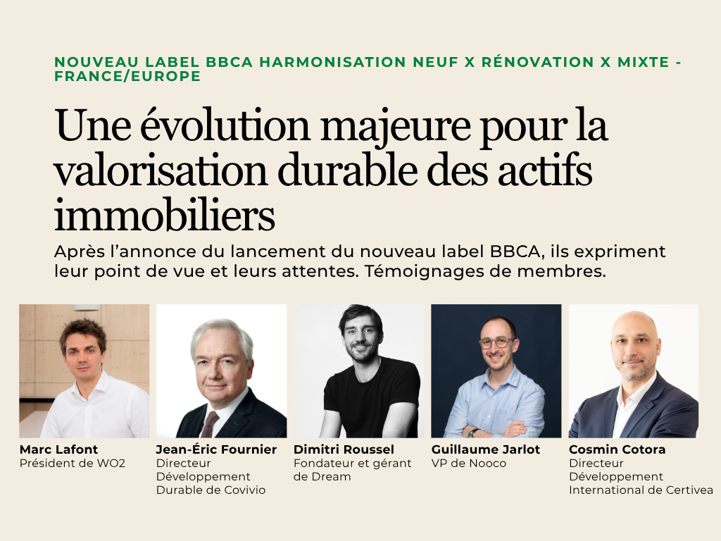 Architecte, certificateur, foncière, promoteur, investisseur, etc. Ils sont membres de BBCA. Ils expriment leurs attentes et leurs espoirs concernant le nouveau label visant à harmoniser la comptabilité carbone entre le Neuf et la Rénovation à l’échelle française et européenne (en collaboration avec LCBI). Une chose est sûre : tous considèrent que ce nouveau label constitue une évolution majeure pour la valorisation durable des actifs immobiliers. Témoignages.